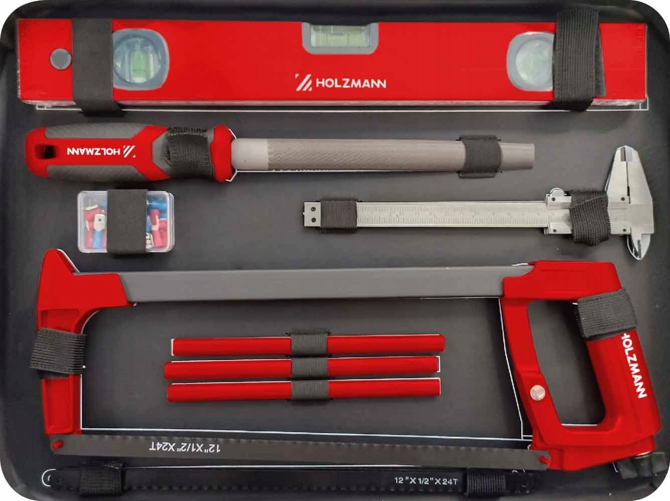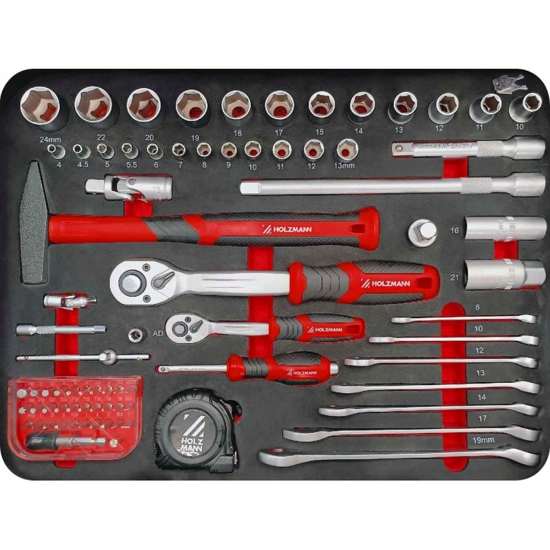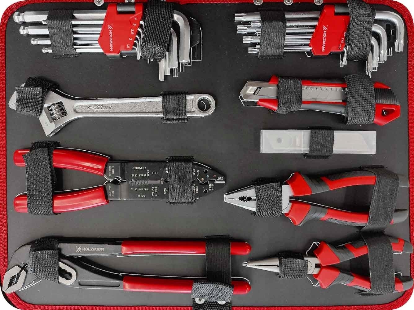 Walizka narzędziowa HOLZMANN WZK167PRO z wysuwaną rączką / funkcją wózka i 167-częściowym zestawem narzędzi uporządkowanym i prawidłowo ułożonym w 4 warstwach.
