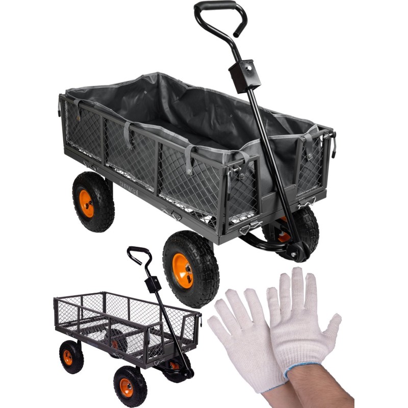 Transportowy wózek wyłożony jest od wewnątrz specjalnym materiałem, aby zapobiec rozsypaniu się zawartości podczas przewożenia. Idealne rozwiązanie do przewożenia drewna, węgla, worków z ziemią, nawozem i innych ciężkich przedmiotów!