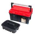 Produkt wyposażony jest w jedną komorę, co ułatwia organizację przechowywanych narzędzi i akcesoriów. Dodatkowo, ergonomiczny uchwyt zwiększa mobilność skrzynki, co sprawia, że można ją łatwo przenosić w różne miejsca. Należy jednak pamiętać, że skrzynka nie posiada kółek, co może wpłynąć na wybór miejsca jej przechowywania.