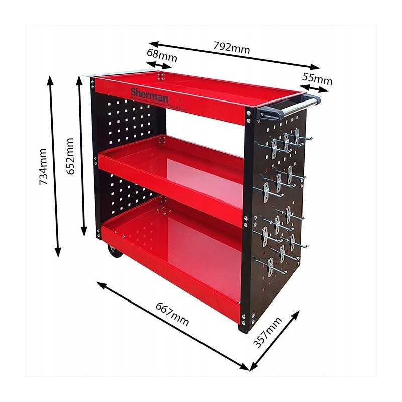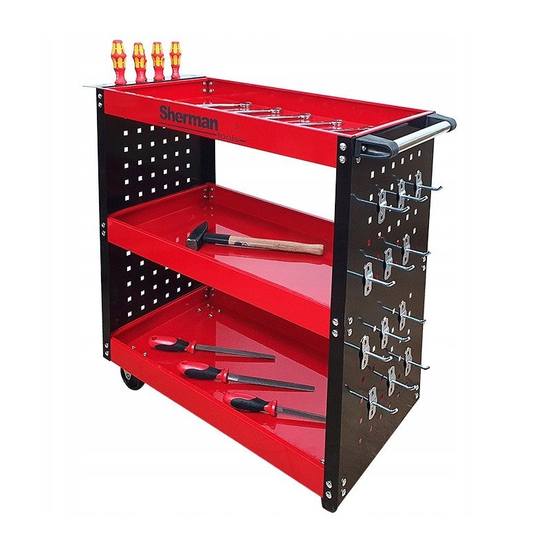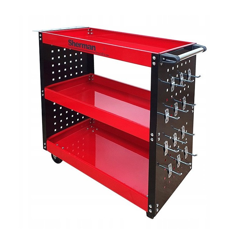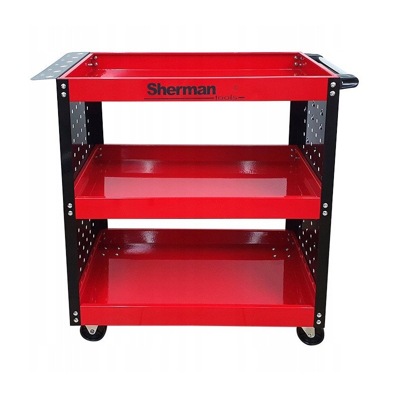 Wózek trzypółkowy warsztatowy narzędziowy 3PA czerwony ze ściankami Sherman – Idealne rozwiązanie do organizacji narzędzi