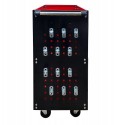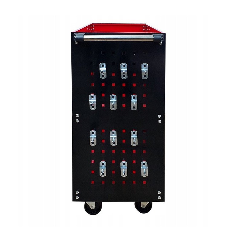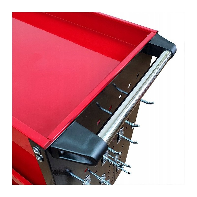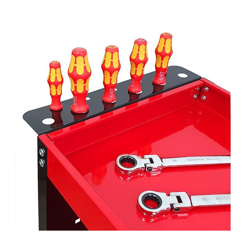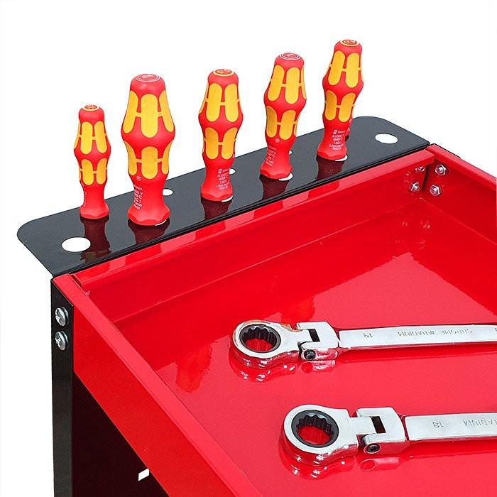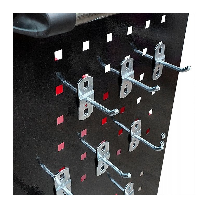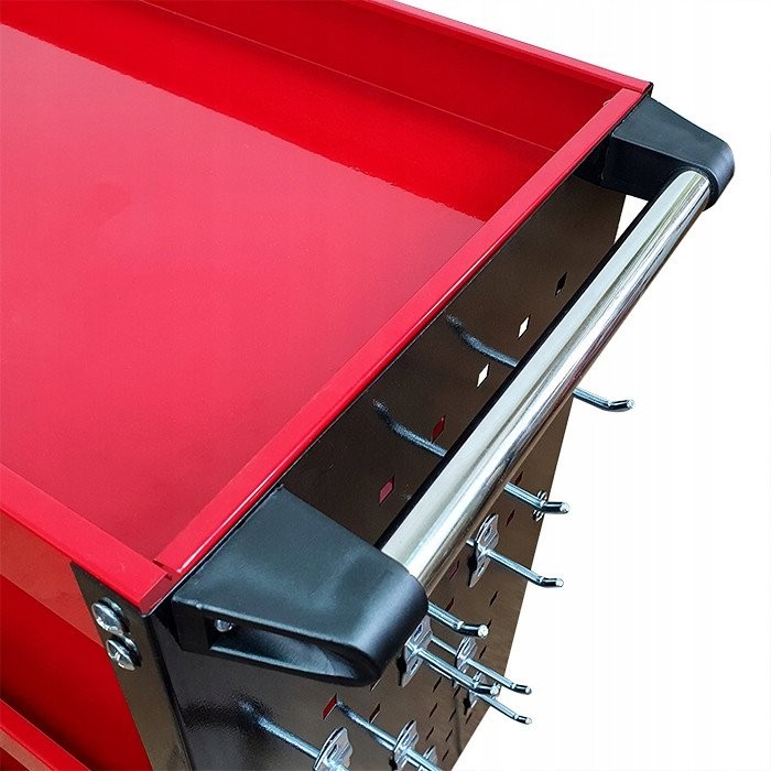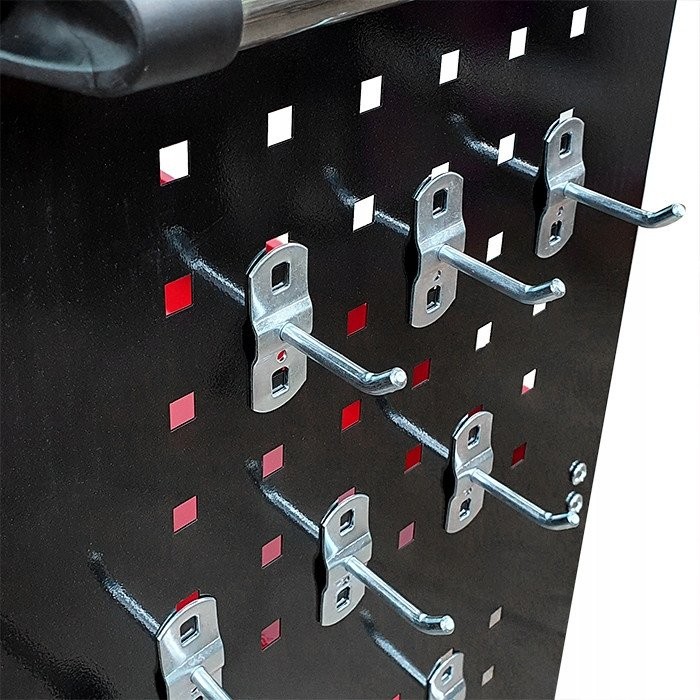 Wózek jest wyposażony w praktyczny uchwyt na wkrętaki oraz boczne ścianki z 12 haczykami, co umożliwia łatwe i wygodne przechowywanie narzędzi. Dzięki temu, wszystkie niezbędne akcesoria są zawsze w zasięgu ręki, co znacznie przyspiesza pracę.