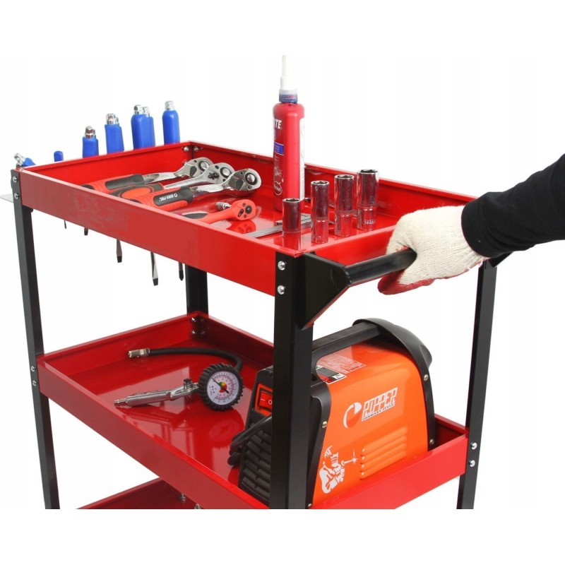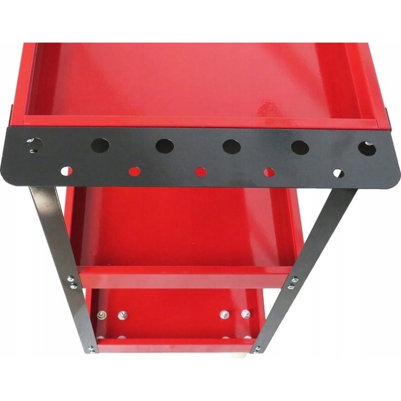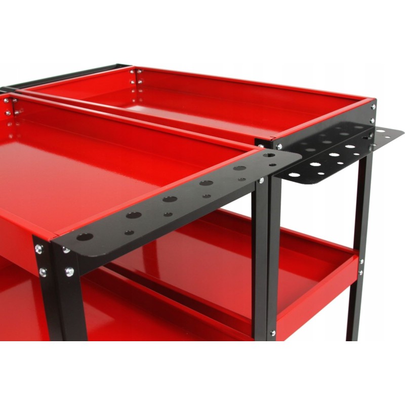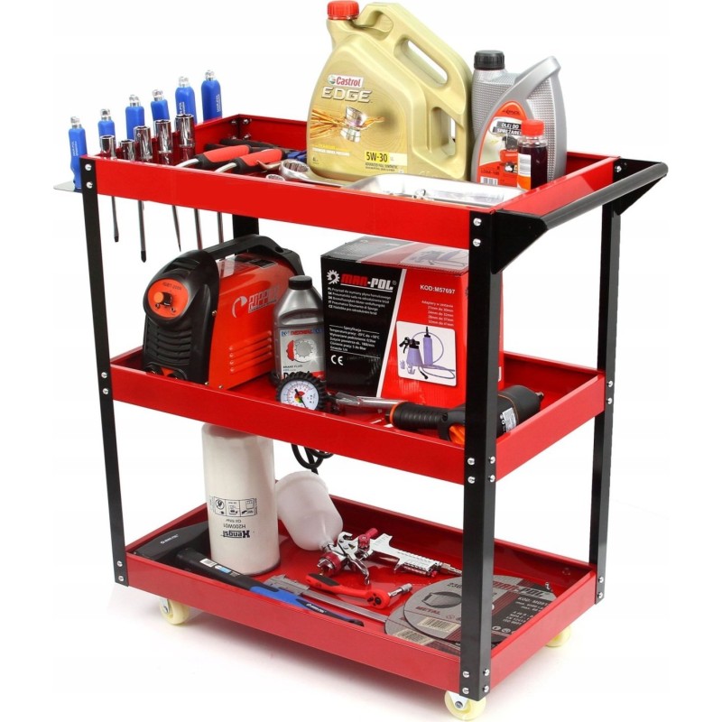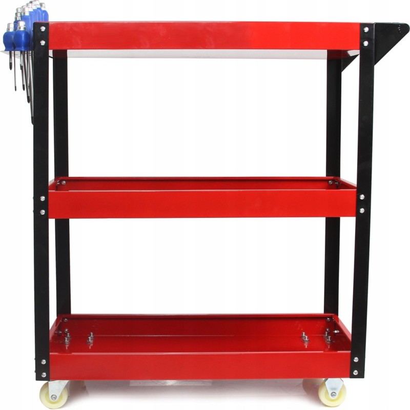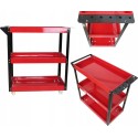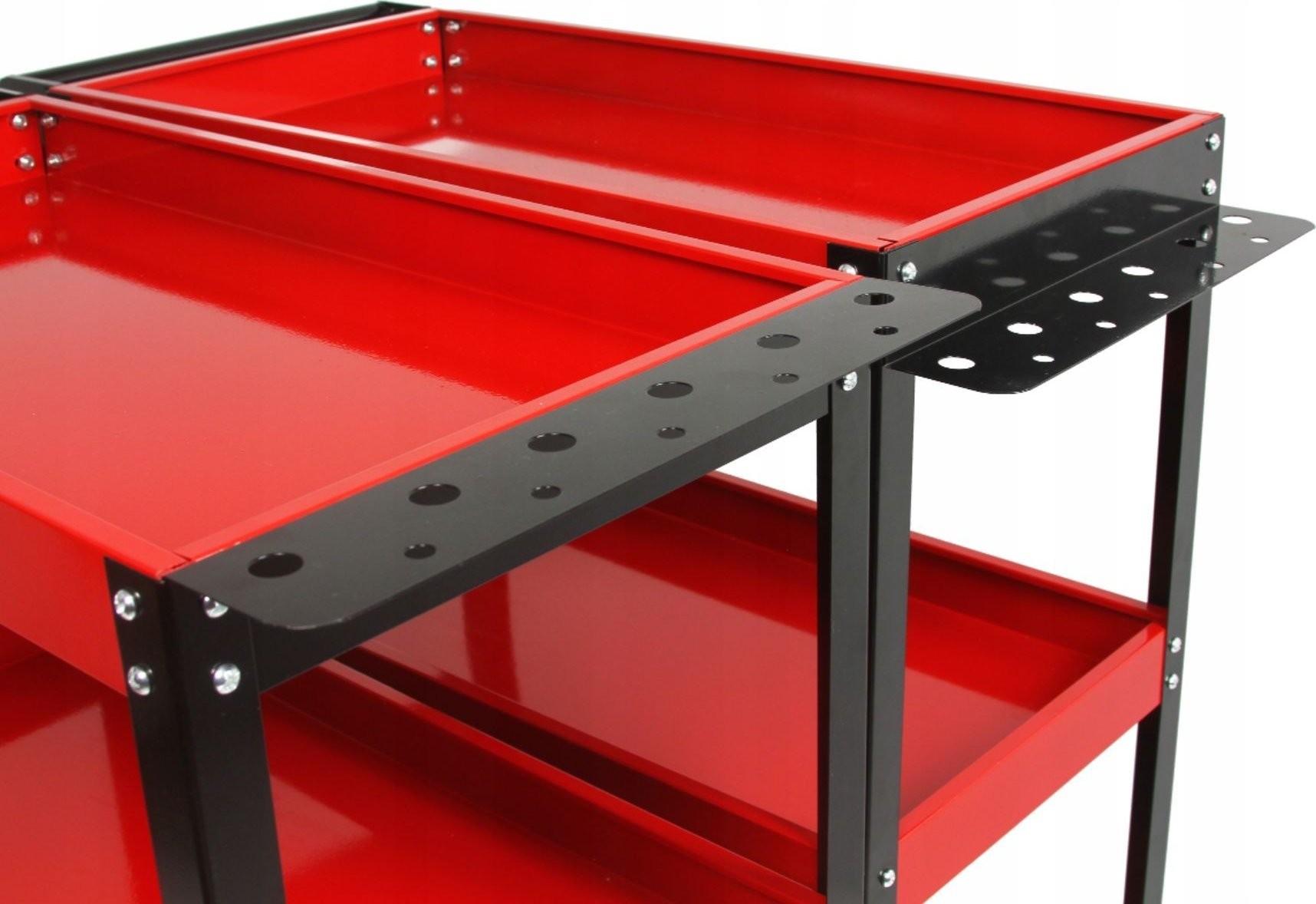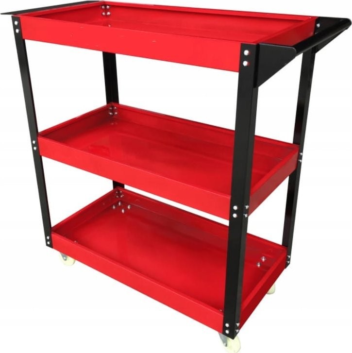 Stalowy wózek z trzema półkami. Idealnie nadaje się do warsztatów, serwisów, a także jest dobrym rozwiązaniem dla majsterkowicza. Ułatwia pracę, każde narzędzie masz zawsze pod ręką.