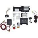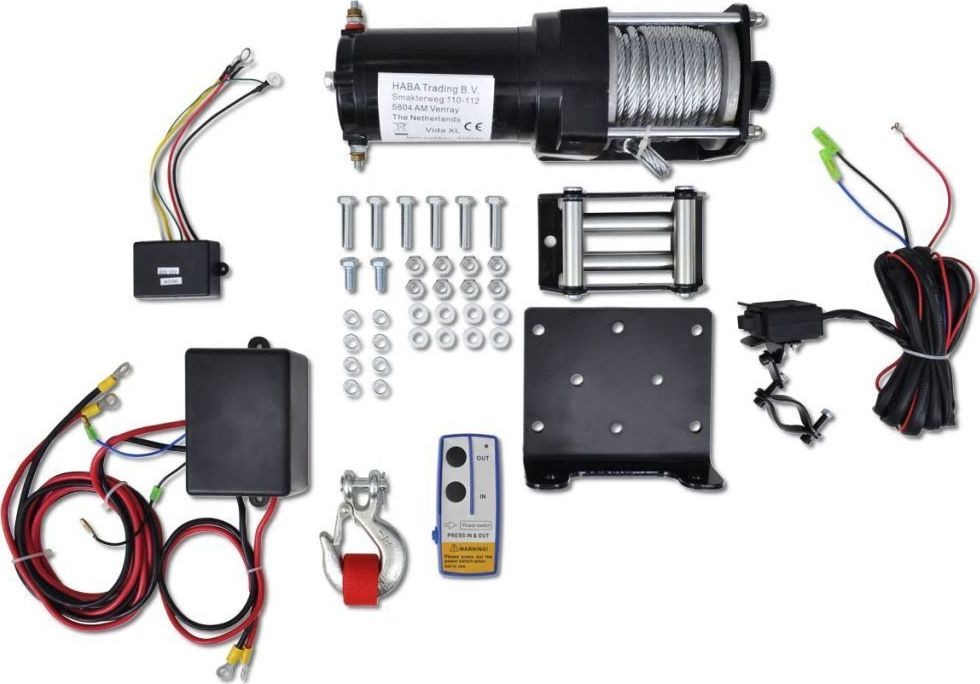 Przesyłka zawiera: 1x wciągarka, 1x płyta montażowa, 1x prowadnica liny, 1x pilot sterowania bezprzewodowego, 1x hak z liną, kabel zasilający oraz akcesoria montażowe (śruby i nasadki).