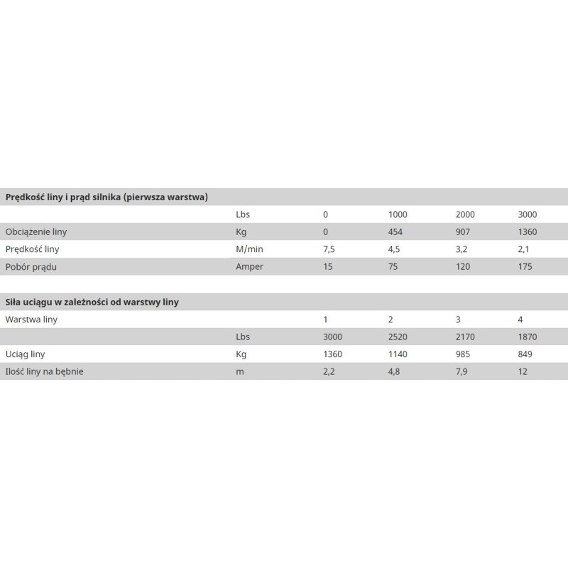- Siła uciągu (lina pojedyncza): 3000lbs / 1361 kg