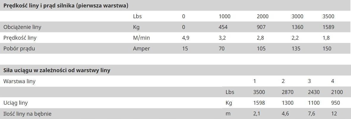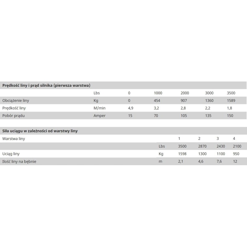 - Siła uciągu (lina pojedyncza): 3500lbs / 1587 kg