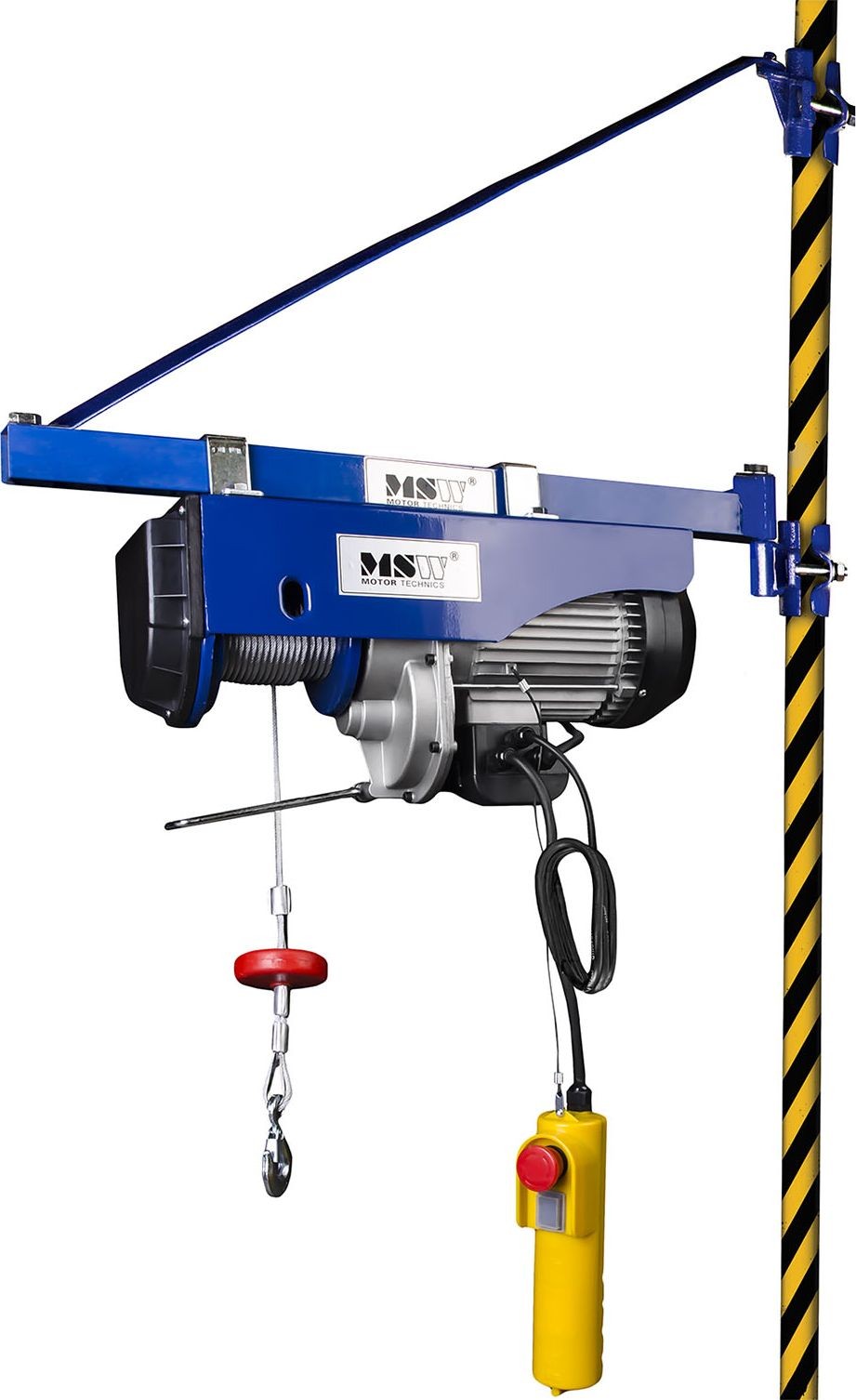 Profesjonalna wciągarka linowa z silnikiem elektrycznym niemieckiego producenta MSW. Dźwig magazynowy charakteryzuje się wytrzymałą konstrukcją, znakomitymi parametrami, łatwością montażu i obsługi oraz bezpieczeństwem użytkowania. Urządzenie wykonane jest z wytrzymałej stali, malowanej proszkowo. Korpus silnika wykonany jest z prasowanego ciśnieniowo aluminium.
