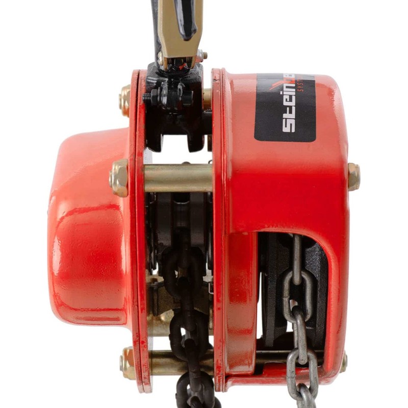 Wyciągarka łańcuchowa marki Steinberg Systems pozwala bezpiecznie podnosić obiekty o wadze do 1 tony w fabrykach, warsztatach czy na placach budowy. Ręczna obsługa pozwala wykorzystać sprzęt w miejscach bez dostępu prądu. Łańcuch wykonany został ze stali, jest solidny i posiada ogniwa o wymiarach 6 mm. Dodatkowo łańcuch jest hartowany a śruby nakrętki i wkręty ocynkowane. Urządzenie pozwala podnieść przedmioty na wysokość 6 m. Trzy biegi odpowiadają za optymalne przenoszenie mocy. Solidny hak pozwala przymocować wyciągarkę do sufitu. Drugi hak ze specjalnym zapięciem pozwala podnosić ładunki.