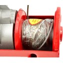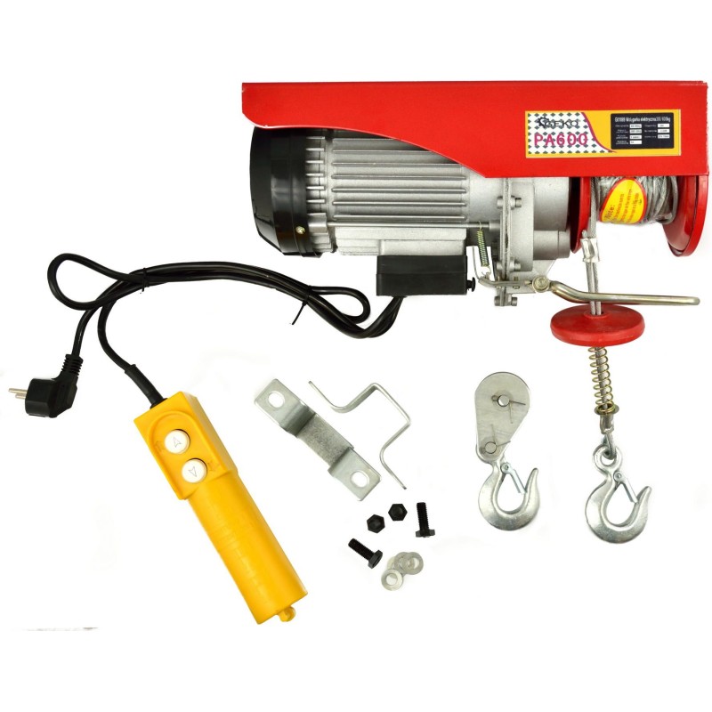 Profesjonalna wciągarka/wyciągarka elektryczna linowa o mocy 1200W i udźwigu do 600 kg. Wyciągarka jest profesjonalnym urządzeniem służącym do podnoszenia ciężkich przedmiotów w płaszczyźnie pionowej. Powszechnie wykorzystywana do budowy i remontu domów oraz do pracy w serwisach mechanicznych. Cechy produktu moc 1200W długość liny: 12 m średnica linki: 4 mm wymiary podstawy: 147 x 385 mm udźwig na jednym haku: 300 kg udźwig na dwóch hakach: 600 kg szybkość podnoszenia na jednym haku: 10 m/min szybkość podnoszenia na dwóch hakach: 5 m/min wysokość podnoszenia na jednym haku: 12 m wysokość podnoszenia na dwóch hakach: 6 m automatyczny wyłącznik bezpieczeństwa miedziane uzwojenie silnika wciągarki znacznie zwiększa żywotność silnika w porównaniu z uzwojeniem aluminiowym wytrzymała aluminiowa obudowa silnika z powiększonymi żeberkami, co pozwala na bardziej skuteczne odprowadzanie ciepła powiększona turbina chłodząca silnika ergonomiczny pilot sterujący z kablem o długości 140cm certyfikat CE Elementy zestawu wciągarka linowa elektryczna 2 uchwyty mocujące 4 śruby mocujące z podkładkami dodatkowy hak z kołowrotkiem