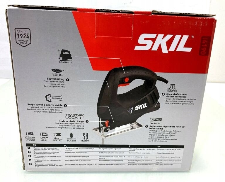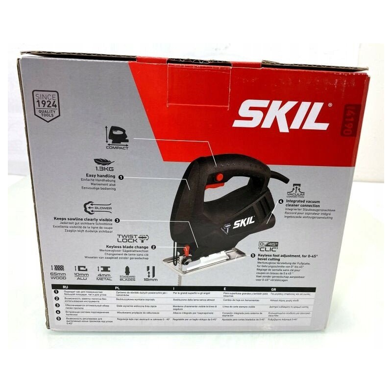 Wyrzynarka Skil 4190 umożliwia precyzyjne cięcie zarówno w linii prostej, jak i krzywej. Jej maksymalna głębokość cięcia wynosi 65 mm w drewnie, co pozwala na łatwe przetwarzanie standardowych materiałów, takich jak panele laminowane, deski, belki czy rury.