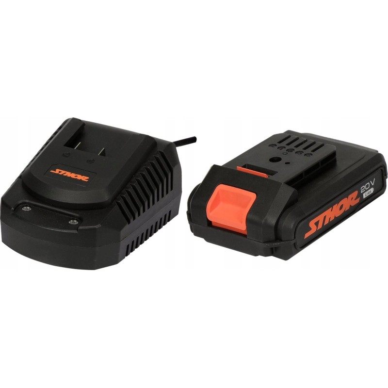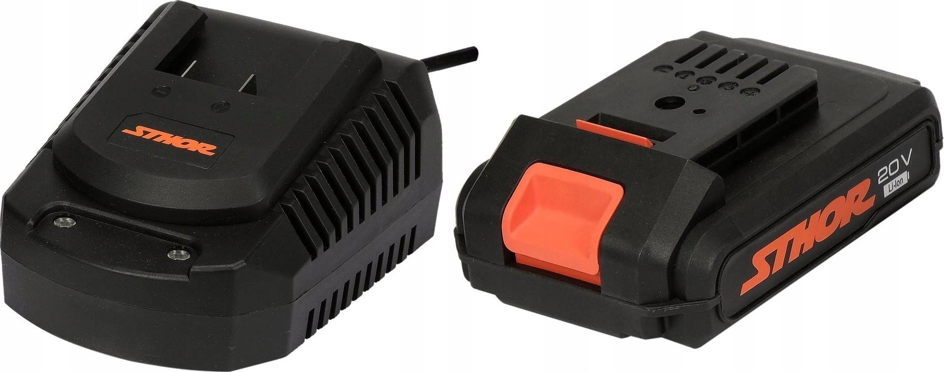 Pracuje na akumulatorze Sthor 20V pasujacym do szerokiej gamy urządzeń np wkretarki,lekka wiertarka sds+ do betonu; piła szablasta, pistolet do kleju itp