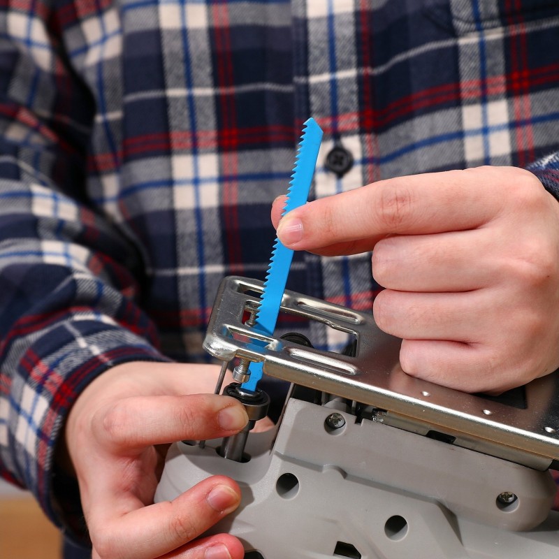 ► Urządzenie posiada metalową, dźwigniową, bezkluczykową wymianę brzeszczotu, dzięki której z łatwością wymienisz jeden brzeszczot, na drugi.