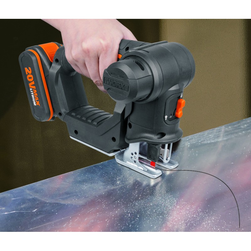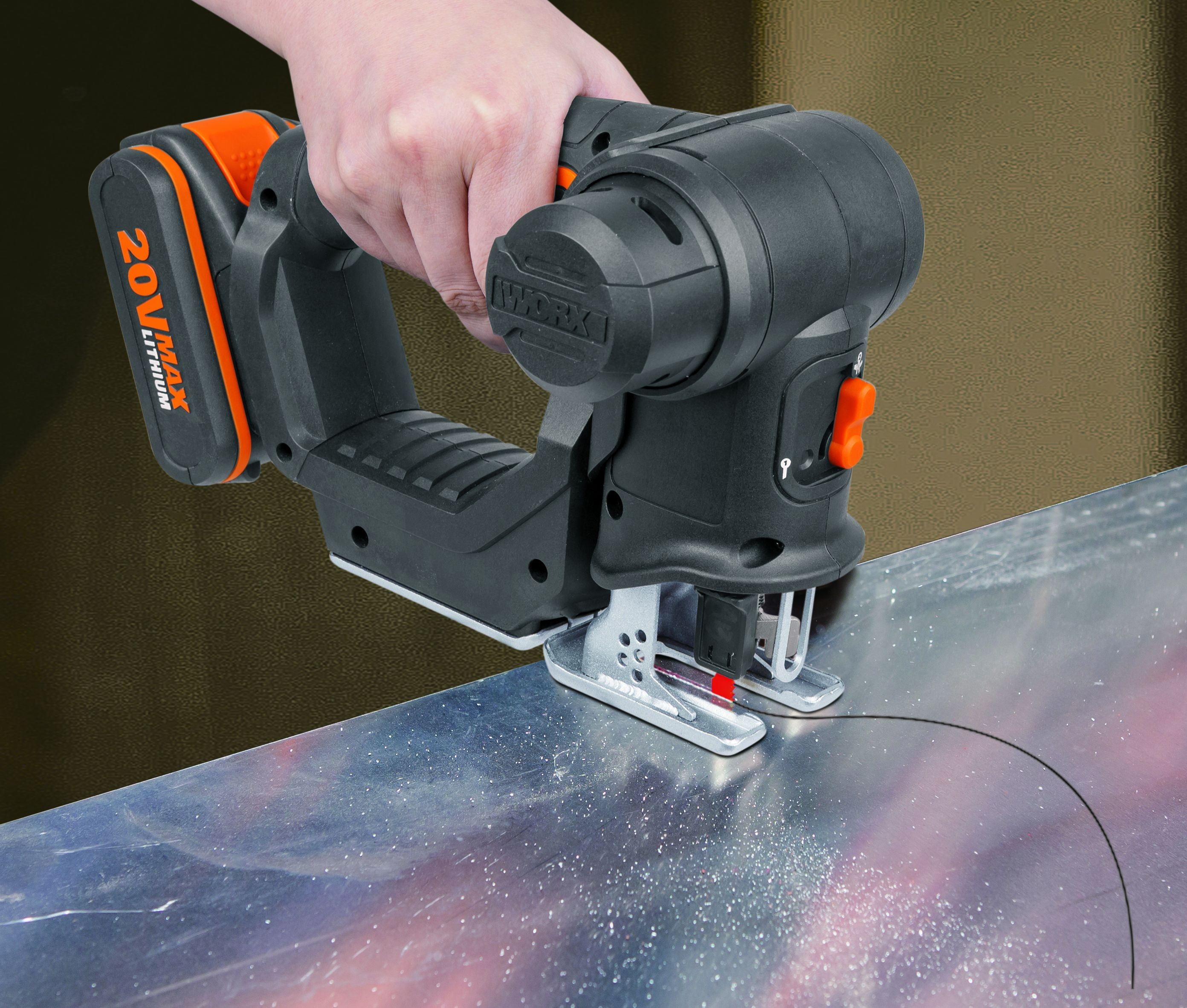 Opiłki na obrabianym materiale pojawiają się przez cały czas. Obniżają widoczność miejsca, w którym w danym momencie wykonuje się cięcia oraz spowalniają pracę, bo trzeba je często ręcznie usuwać. Firma Worx wyszła jednak naprzeciw temu problemowi, z jakim zmagają się fachowcy. Wyrzynarka z dmuchawą przeciwpyłową na bieżąco usuwa kurz, opiłki i wszelkie zanieczyszczenia.
