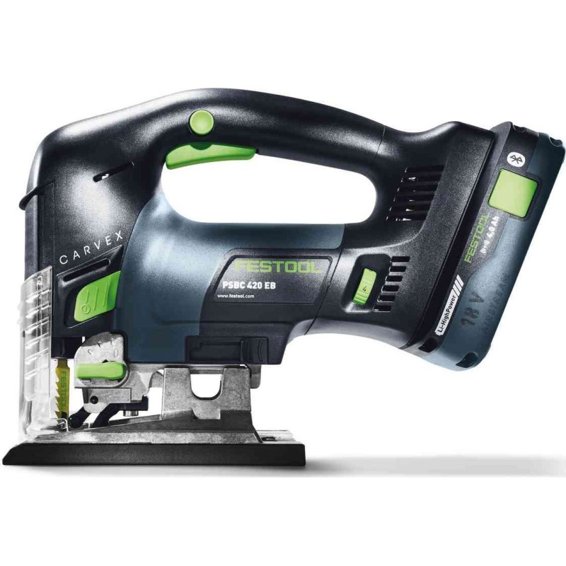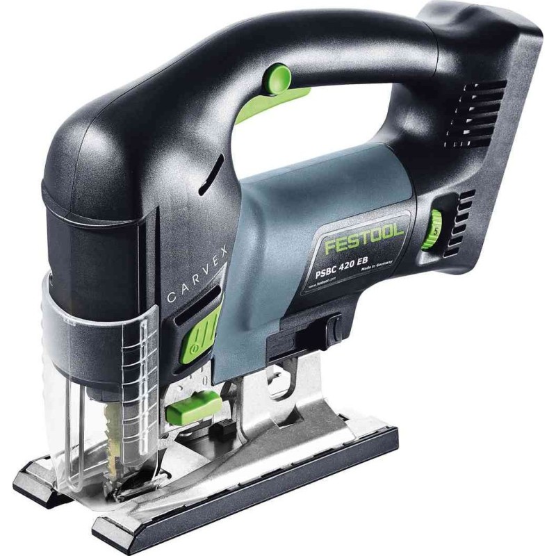 Festool CARVEX PSBC 420 EB-Basic. Rodzaj uchwytu: Górny uchwyt, Kolor produktu: Czarny, Niebieski. Skok jałowy (maks.): 3800 spm, Głębokość cięcia drewna: 12 cm, Częstotliwość skoku jałowego (min.): 1000 spm. Źródło zasilania: Bateria, Napięcie baterii: 18 V. Waga produktu: 2,3 kg