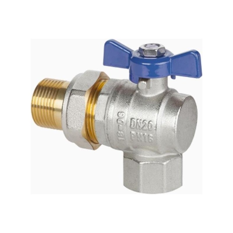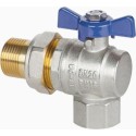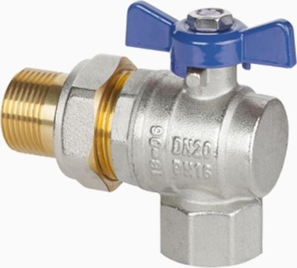 Zawór kulowy, odcinający, kątowy ze śrubunkiem i motylkiem do instalacji wodnych lub grzewczych.
