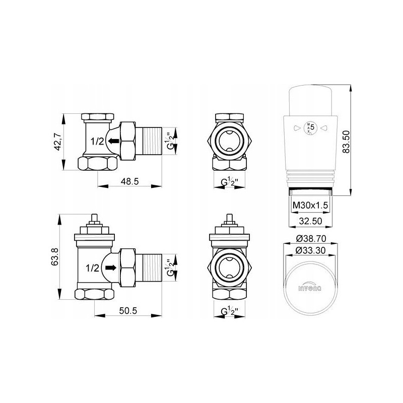 Na korpusach zaworów oznaczenie rozmiaru przyłącza 1/2” oraz kierunku przepływu medium.