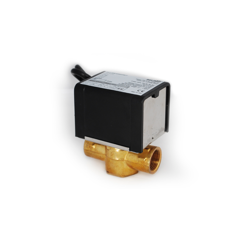 - Zawór ON/OFF z siłownikiem elektrycznym, montowany w miejscu powrotu wody z wymiennika, umożliwia odcięcie przepływu czynnika grzewczego
