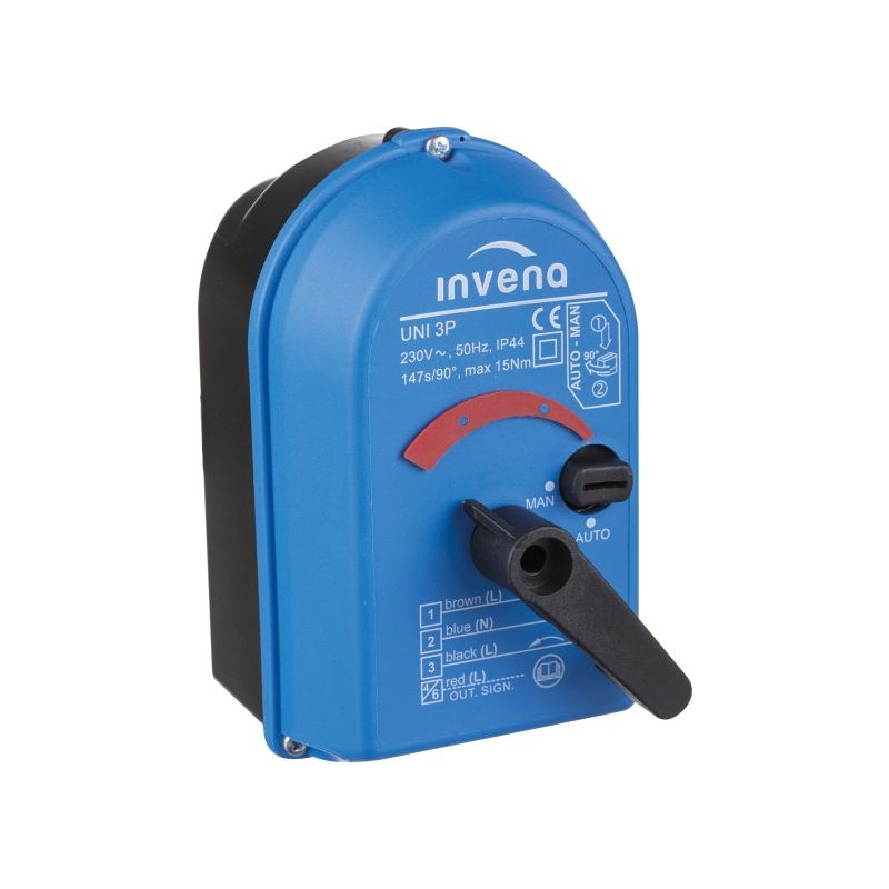Siłownik zaworu INVENA może być używany do napędu zaworów mieszających. Siłowniki mogą być obsługiwane za pomocą sterownika/kompensatora z 3-pozycyjnym wyjściem.