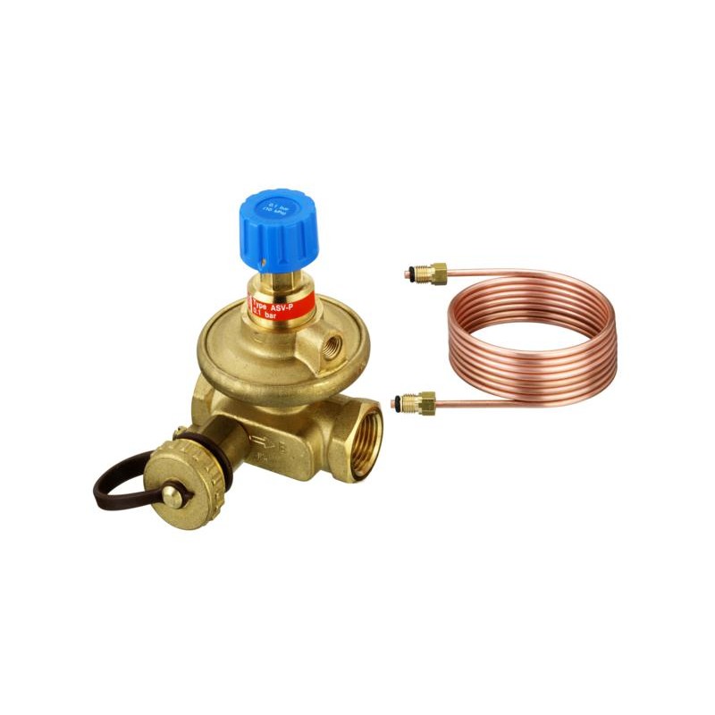 - ASV-P jest automatycznym zaworem równoważącym, który zapewnia utrzymanie stałej różnicy ciśnień w pionie na poziomie 0,1 bar (10 kPa).