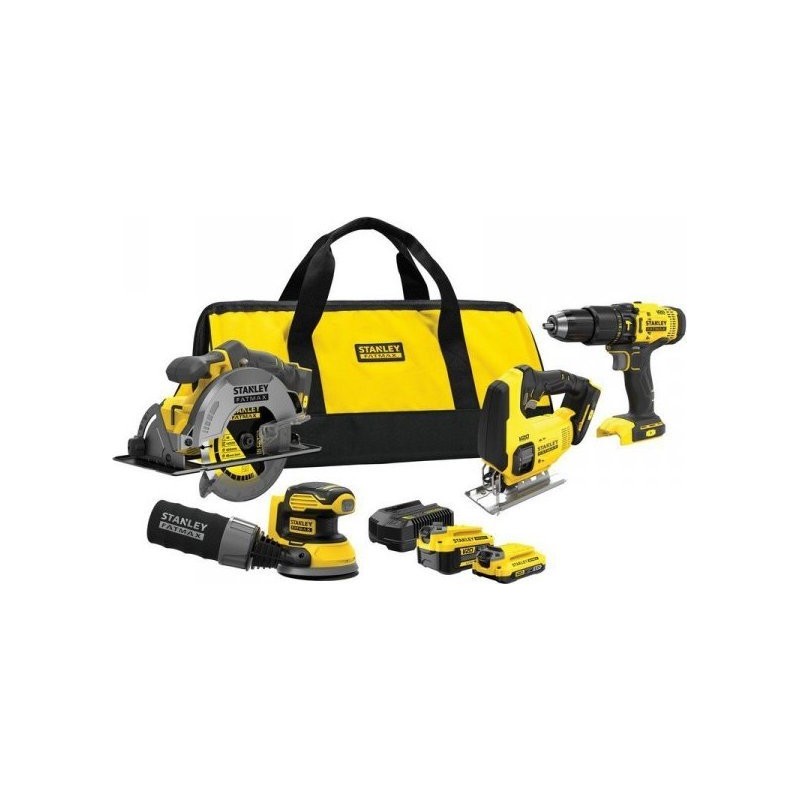 Zestaw elektronarzędzi Stanley Fatmax SFMCK412MDS to zestaw narzędzi akumulatorowych, który zawiera wiertarko-wkrętarkę, szlifierkę mimośrodową, pilarkę tarczową, wyrzynarkę, dwa akumulatory, ładowarkę i torba transportową.