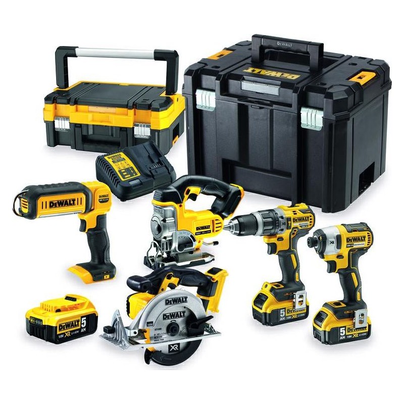 Zestaw narzędzi akumulatorowych DCK551P3T DeWALT zawiera dwie maszyny do prac montażowych i dwie maszyny do cięcia oraz lampę do oświetlania miejsca pracy. Wiertarko-wkrętarka dzięki możliwości pracy z udarem mechanicznym może również wykonywać otwory w lekkich materiałach budowlanych. Zakrętarka wyposażona w trzy poziomy prędkości obrotowej sprawdzi się przy szybkim wkręcaniu małych wkrętów i śrubek oraz łączeniu za pomocą największych wkrętów i odkręcaniu dużych nakrętek. Pilarka tarczowa pozwala na precyzyjne i szybkie cięcie drewna wzdłuż i w poprzek słojów. Wyrzynarka natomiast pozwala na cięcie krzywolinijne i, przy odpowiednim osprzęcie, obróbkę każdego materiału. Combo ma do dyspozycji trzy akumulatory 18V z linii XR o pojemności 5.0Ah. Wszystkie maszyny, ich osprzęt, ładowarka i baterie dostarczane są w dwóch walizkach systemowych. Mniejszy model może posłużyć jako skrzynka na wkrętarkę i zakrętarkę. Jej organizer pomieści wiele wierteł, bitów, wkrętów i innych drobiazgów. Duży kufer dedykowany jest do pilarki i wyrzynarki oraz innych większych narzędzi.