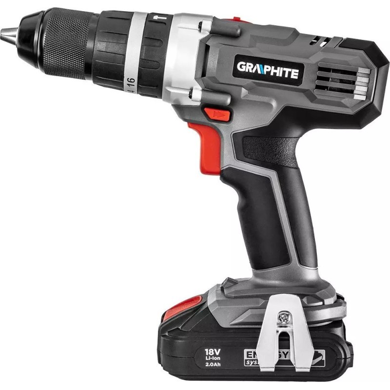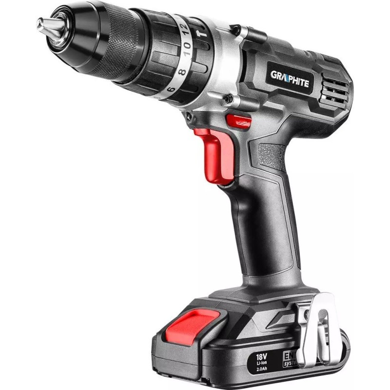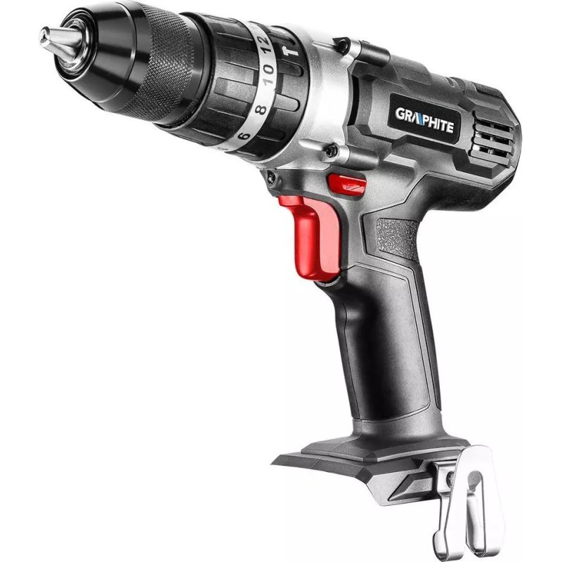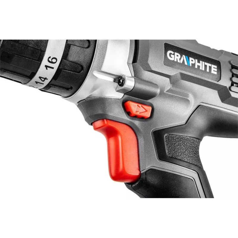 Wiertarko-wkrętarka posiada elektryczny hamulec silnika oraz automatyczną blokadę wrzeciona. Dioda LED doświetla miejsce pracy. Samozaciskowy uchwyt umożliwia wygodny montaż osprzętu o średnicy od 2 do 13 mm. Ergonomiczna, dwumateriałowa rękojeść zapewnia komfort użytkowania oraz pewność chwytu. Ta wiertarko-wkrętarka oraz szlifierka marki GRAPHITE to sprawdzone elektronarzędzia, przeznaczone na wiele lat użytkowania.