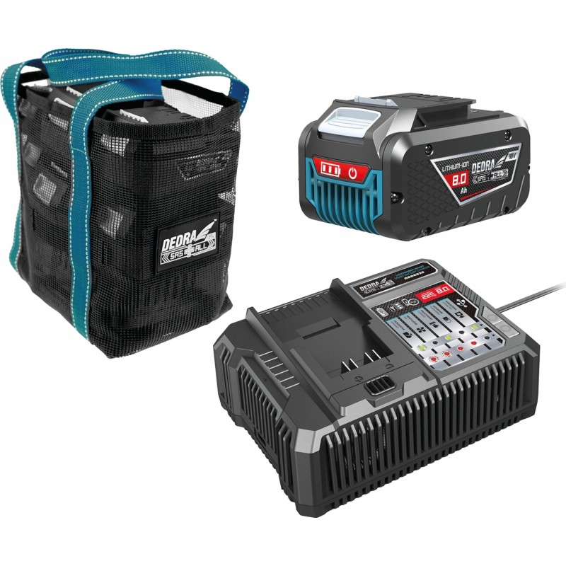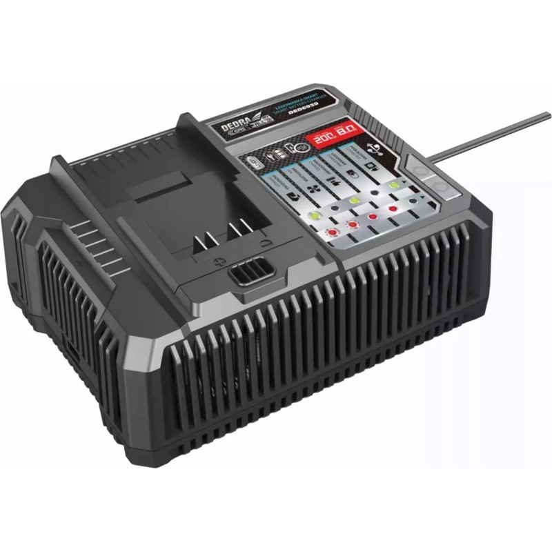 Ta ładowarka typu SMART to produkt dedykowany do ładowania baterii z linii DEDRA SAS+ALL (DED7032, DED7034, DED7035, DED6936, DED6937). Wyposażona w wentylator, skutecznie chłodzi baterię podczas jej ładowania, co efektywnie chroni ogniwa przed przegrzaniem i ma pozytywny wpływ na żywotność baterii.