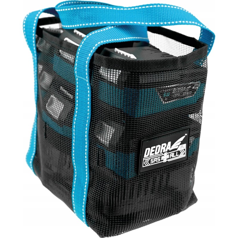 Torebka, pokrowiec na dwa akumulatory i ładowarkę DEDRA SAS+ALL DED7002A: Torba/etui przeznaczona do transportu akumulatorów i ładowarki z systemu SAS+ALL. Wykonana z lekkiej siateczki oraz pasów pełniących funkcję uchwytów. Niewielka waga oraz użyty materiał pozwala na bezproblemowe przechowywanie torby w każdym miejscu. Pokrowiec pozwala transportować przykładowo jedną ładowarkę oraz do sześciu akumulatorów DED7034/DED7035.