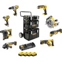 Multi-częściowy zestaw, który zawiera kilka głównych jednostek, baterii, trzy-biegową wiertarkę wielofunkcyjną DCD996, wkrętarkę udarową DCF887, młot kombi DCH273, DCG405, piłę tarczowa DCS570, DCS355, wyrzynarkę DCS 367, lampy LED DCL050.