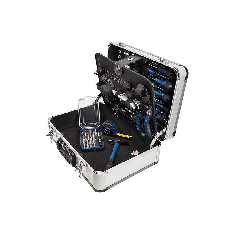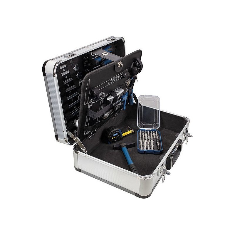 - Zawiera między innymi 1 grzechotkę dwustronną z różnymi nasadkami, po 1 szczypce do pomp wodnych, kombinerki, obcinaki boczne, nóż trapezowy, młotek, piłę ręczną, nożyczki uniwersalne, próbnik napięcia, taśmę mierniczą oraz kilka kluczy płaskich, śrubokrętów, Klucze imbusowe i bity w różnych rozmiarach