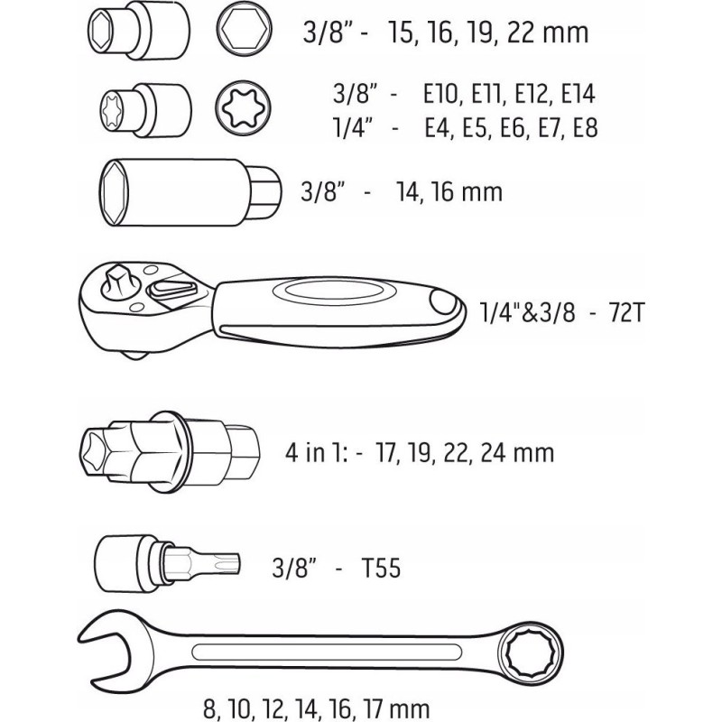 Narzędzia zawarte w zestawie są rekomendowane do motocykli różnych marek i modeli, co czyni je uniwersalnym rozwiązaniem. Niezależnie od tego, czy jesteś profesjonalnym mechanikiem, czy pasjonatem motocykli, ten zestaw spełni Twoje oczekiwania.