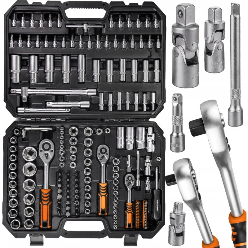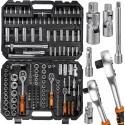 - 1/2": 17 nasadek, 5 długich nasadek, nasadki typu E, nasadki do świec, pokrętło z grzechotką, przedłużki oraz łącznik przegubowy.