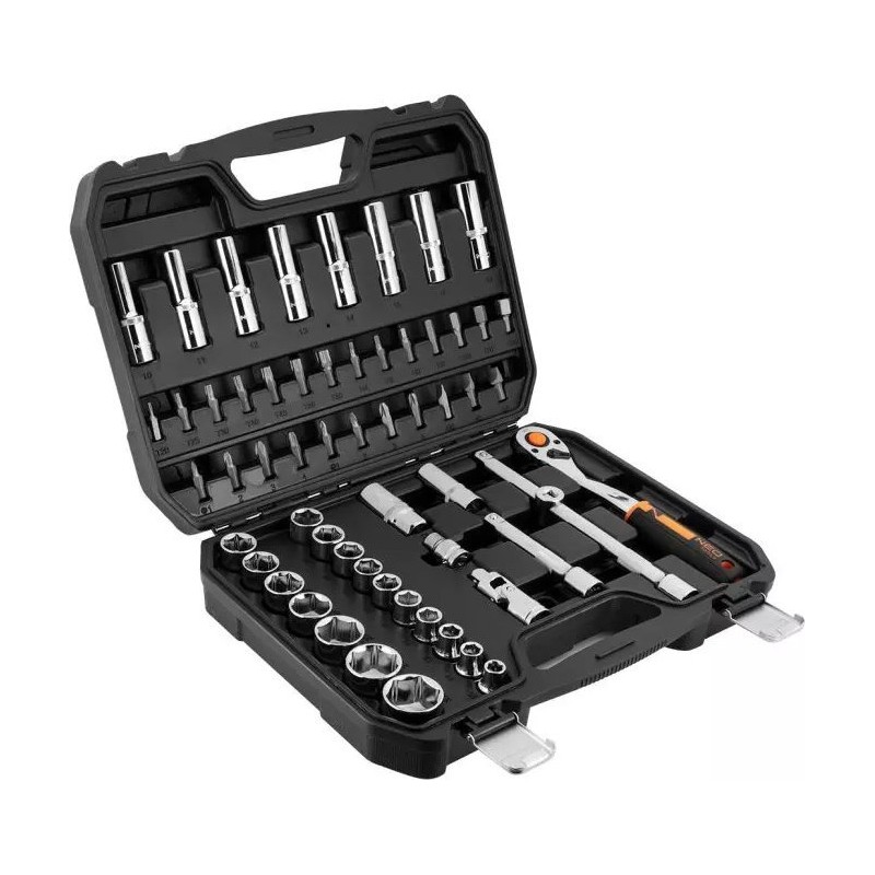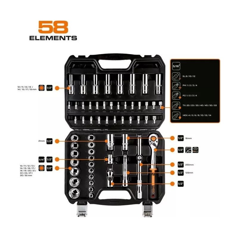 Wielozadaniowy zestaw kluczy ½” wysokiej jakości, zawierający 58 sztuk narzędzi oraz akcesoriów od marki NEO. Produkty oferowane w praktycznej walizce z tworzywa sztucznego. Dodatkowo, wnętrze opakowania zostało wyłożone specjalną wkładką, która umożliwia utrzymanie porządku i zabezpiecza zawartość przed uszkodzeniem.