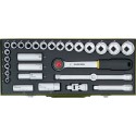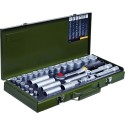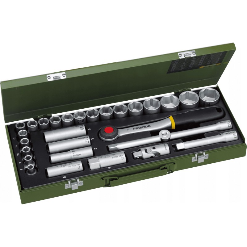 PROXXON Zestaw kluczy nasadowych ½ zawiera 29 elementów. Wśród nich znalazły się dwa rodzaje nasadek: standardowe i do świec. Oprócz nich komplet oferuje też pokrętła do nasadek, przeguby, przedłużki oraz grzechotkę. Rozmiar elementów dopasowano do popularnego standardu wielkości 1/2". Elementy dobrano tak, by spełniały wszystkie oczekiwania i potrzeby użytkownika. Wyposażenie w uniwersalne elementy sprawia, że zestaw sprawdzi się w wielu sytuacjach. Duży wybór elementów doceni każdy użytkownik.