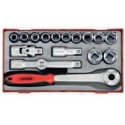 Zawiera 12 nasadek z otworem chwytowym 12- lub 6-kątnym. Ponadto w skład zestawu wchodzi pokrętło zapadkowe z kierunkiem działania przełączanym za pomocą dźwigienki, przedłużacze 62 i 150 mm, łącznik przejściowy 3/8″- 1/2″ oraz przegub uniwersalny. Dostarczany w pojemniku tworzywowym z odłączaną pokrywą. Pasuje do skrzynek i wózków narzędziowych Teng Tools.