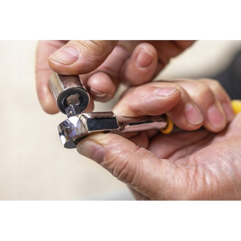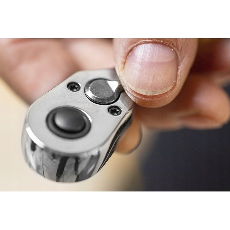 Duża szybkozłączka grzechotki ułatwia wymianę nasadek. Niskoprofilowy przełącznik zabezpiecza zapadkę przed przypadkowym obrotem i umożliwia sprawną pracę jedną ręką.