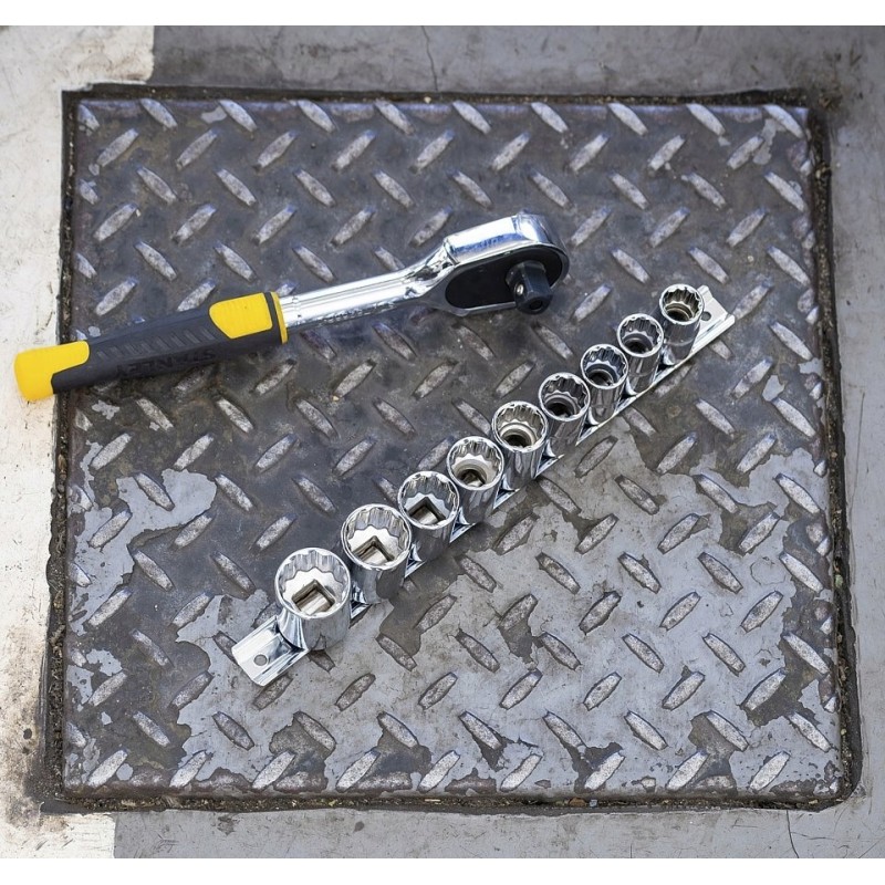 Zestaw kluczy nasadowych marki Stanley zawiera jedną grzechotkę 3/8” oraz 10 polerowanych nasadek dwunastokątnych w rozmiarach 8/9/10/11/12/13/14/15/16/17 mm, dzięki czemu sprawdzi się podczas majsterkowania. W zestawie listwa, dzięki której łatwo uporządkujesz wszystkie nasadki.