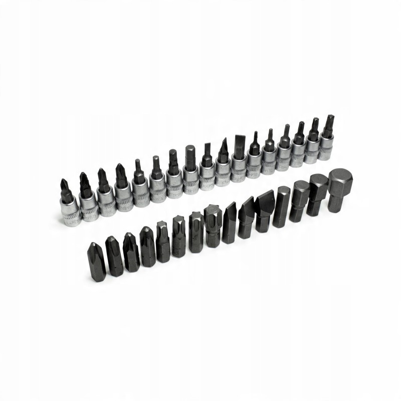 Zestaw oferuje bogaty wybór nasadek i bitów, które umożliwiają realizację różnorodnych zadań. Nasadki 1/4" obejmują rozmiary od 4 mm do 14 mm, natomiast nasadki 1/2" od 14 mm do 32 mm. Dodatkowo, w zestawie znajduje się 17 różnych bitów, co czyni go niezwykle wszechstronnym.