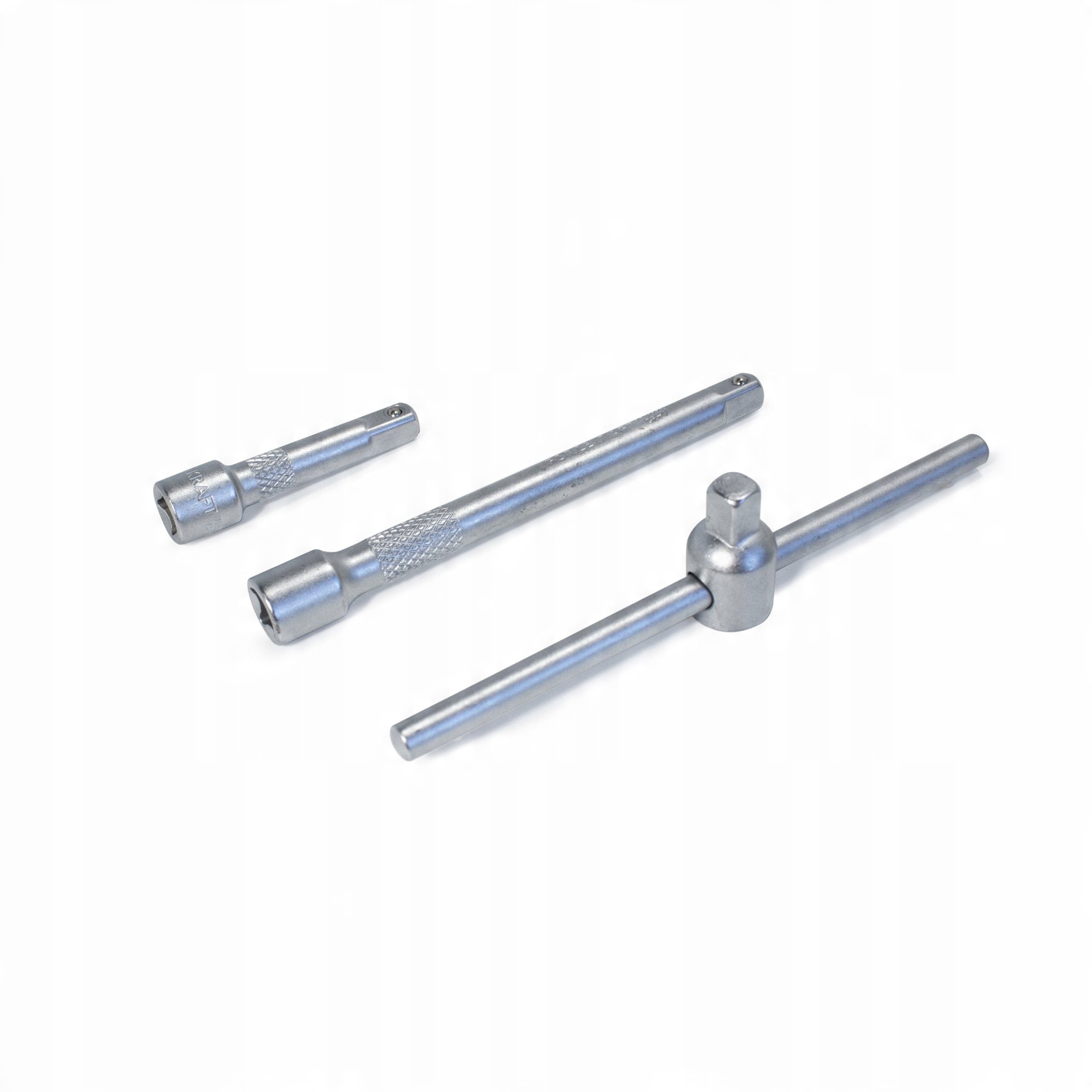 W zestawie znajdują się przedłużki o długościach 2", 4", 5" i 10", a także elastyczna przedłużka 6", co umożliwia dotarcie do trudno dostępnych miejsc. Przeguby Cardana zwiększają elastyczność i komfort pracy, pozwalając na łatwe manewrowanie narzędziami.