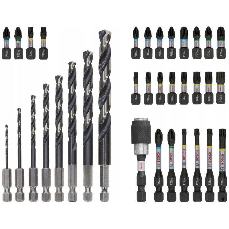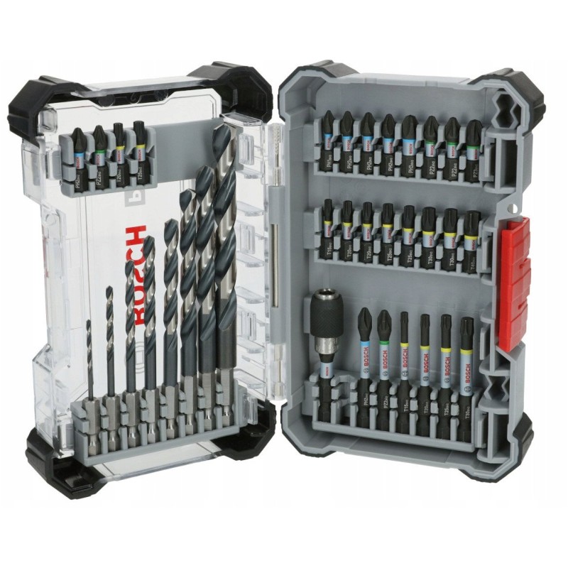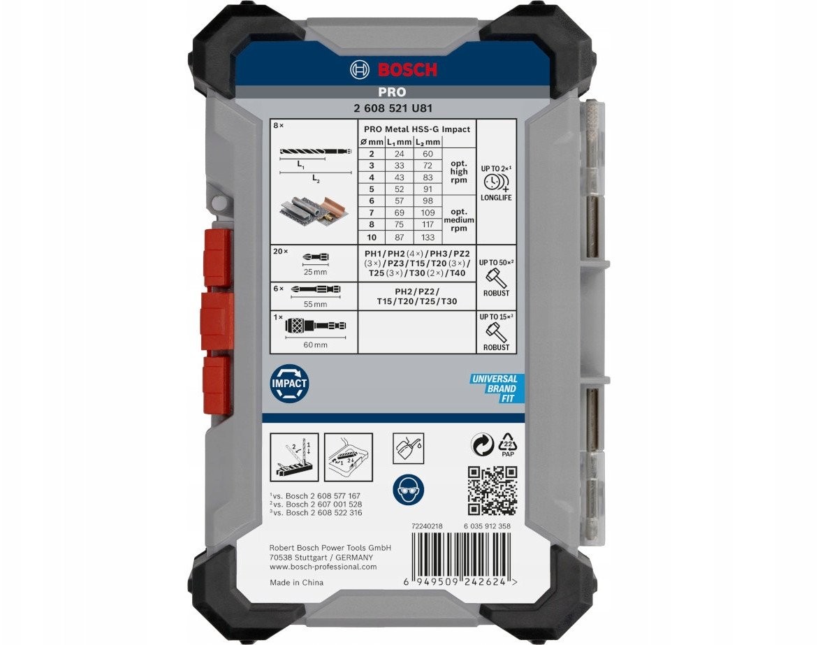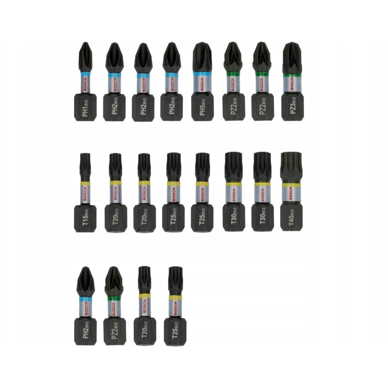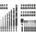 W skład zestawu wchodzi 20 końcówek wkrętarskich o długości 25 mm oraz 6 końcówek o długości 55 mm, a także 8 wierteł do metalu typu HSS-G Impact Twist. Dzięki tytanowej powłoce wierteł, ryzyko przywierania wiórów jest znacznie zmniejszone, co podnosi komfort pracy.