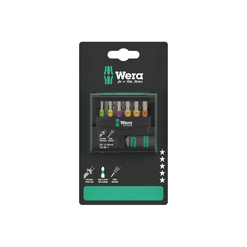 Zestaw narzędzi do bitów, idealny do prac w drewnie. Przydatne w trudno dostępnych miejscach, gdzie przytrzymanie śruby drugą ręką nie jest możliwe. Przeznaczone również do profili Würth ASSY oraz Altenloh SPAX T-STAR plus. Z systemem wyszukiwania narzędzi Wera "Take it easy": system oznaczenia kolorystycznego bitów według rozmiaru. Uchwyt Rapidaptor z magnesem pierścieniowym do przytrzymywania długich i ciężkich śrub. Zestaw Bit-Check umożliwia szybki podgląd dostępnych narzędzi. Narzędzia, które nie są już używane, można po prostu odłożyć z powrotem do zestawu, co wyklucza ryzyko ich zgubienia. Łatwy transport, np. w kieszeni koszuli. Zestaw narzędzi Bit-Check można ustawić na stanowisku pracy, co zapewnia szybki dostęp do narzędzi.