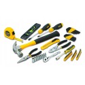 W skład zestawu wchodzą różnorodne narzędzia, takie jak młotek, śrubokręt, cutter, szczypce, uchwyt na klucze nasadowe oraz grzechotka z nasadkami. Taka różnorodność sprawia, że zestaw jest idealny do realizacji różnych zadań, od prostych napraw po bardziej skomplikowane projekty.