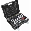 Zestaw 25 elementów:Nasadki sześciokątne 1/2" (18 szt)Klucz grzechotka 1/2” (1 szt) Przedłużki 1/2” (2 szt) Przedłużane nasadki do świec 1/2” (2 szt) Przegub Cardana 1/2” (1 szt) Pokrętło typy T (1