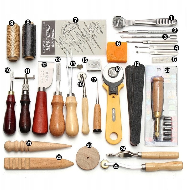 W skład zestawu wchodzą różnorodne narzędzia, które znacznie ułatwiają pracę ze skórą. Dzięki nim możesz zrealizować swoje projekty rzemieślnicze z łatwością i precyzją.