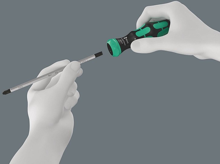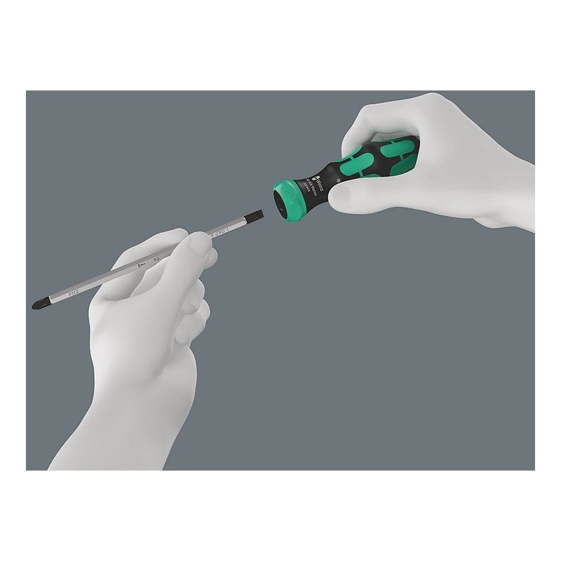 Rączka zestawu Wera Kraftform została stworzona z myślą o maksymalnym komforcie użytkowania. Wyposażona w drobnozębny mechanizm grzechotki, umożliwia szybkie i precyzyjne dokręcanie, co znacznie przyspiesza pracę. Jej ergonomiczny kształt sprawia, że narzędzie doskonale leży w dłoni, co jest kluczowe podczas długotrwałych zadań.