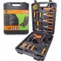 Skład zestawu obejmuje 57 wysokiej jakości narzędzi, takich jak klucze, młotek, szczypce i wiele innych niezbędnych akcesoriów. Każdy element został starannie wybrany w celu zapewnienia trwałości, niezawodności i skuteczności w codziennej pracy.