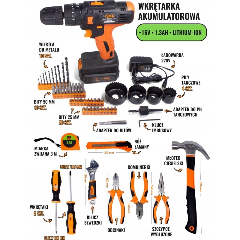 Zestaw ten oferuje szeroki wybór narzędzi i praktyczną wkrętarkę, które pozwolą na wykonanie napraw, montażu i prac konserwacyjnych.