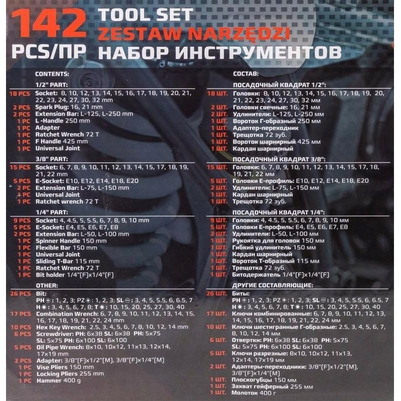 ROZSZERZONY ZESTAW NARZĘDZI NASADKI KLUCZE WKRĘTAKI BITY 142el. 1/4" 3/8" 1/2" 4-36mm 6-kątnych