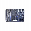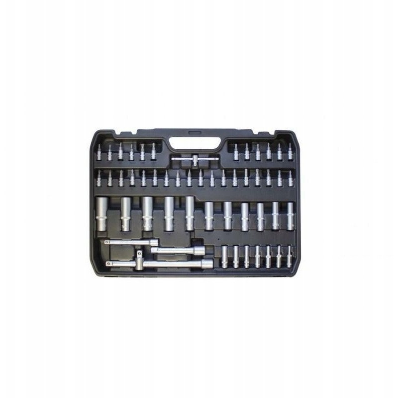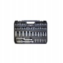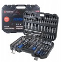 W skład zestawu wchodzą trzy grzechotki o rozmiarach 1/4", 3/8" oraz 1/2", a także nasadki w rozmiarze od 4 do 32 mm (6-kątne). Dodatkowo, zestaw zawiera bity w różnych rozmiarach i końcówkach, przeguby, przedłużki, klucze imbusowe, adaptery, wkrętaki, pokrętła oraz uchwyty.