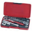 Zestaw składa się z 34 elementów. Zawiera 9 krótkich nasadek sześciokątnych, pokrętło zapadkowe wzmocnione włóknem szklanym, przedłużacze o długości 75 i 150 mm, łącznik redukcyjny czopa chwytowego 1/2" - 3/8", nasadkę pod groty wkrętakowe oraz 17 grotów. Dostarczany w czerwonym pudełku z tworzywa sztucznego z zamkiem zatrzaskowym i zawiasem z metalową ośką.