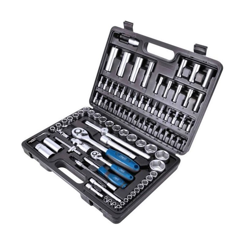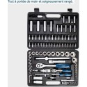 - Kompaktowy zestaw narzędzi zawiera 2 grzechotki ½ cala i ¼ cala, różne klucze nasadowe, bity i wiele innych akcesoriów